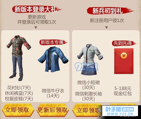玩家更新游戏版本,并且登录之后,可以领取一份新版本礼包,另外新注册的用户还能领取一份新兵礼包。