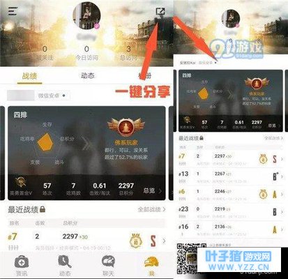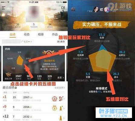 想要和朋友较量一下实力?那就用数据说话吧! 在他人战绩页面,点击战绩卡片中的五维图,即可跳转至玩家对比页面,大家可以很直观地看到包括吃鸡率、生存、战斗在内的多种积分对比,知己知彼(才能选择大神队友)。 【一键分享,炫技神器】