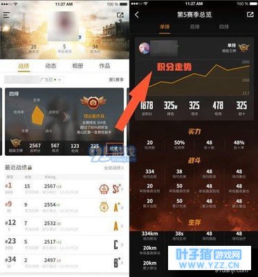 相比之前,新版助手的战绩页面更加清晰美观,五维图、段位、场次、吃鸡数等战绩信息以卡片模式展示,左右滑动即可轻松切换单排、双排、四排。 【积分走势,了如指掌】