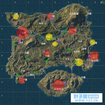 从Z城出发,向南行驶,会抵达G港,此处物资丰富,房屋数量比Z城还要多不少,这也代表着经常有玩家光临这里。常常在游戏初期,就可以在G港听到响彻天际的枪声。 在G港的不远处还有医院,这里存在的物资也是比较丰厚的,且因风景独特,楼层架构特别,玩家们喜欢在此处磨练枪法。 地图左侧有一片区域名为G镇,有些萌新玩家会将其与G港混淆,此处的物资并没有G港那么多。且距离G港和医院较远,如果玩家想要以打野这一战术贯穿整局游戏,可以考虑降落于这个地方。
