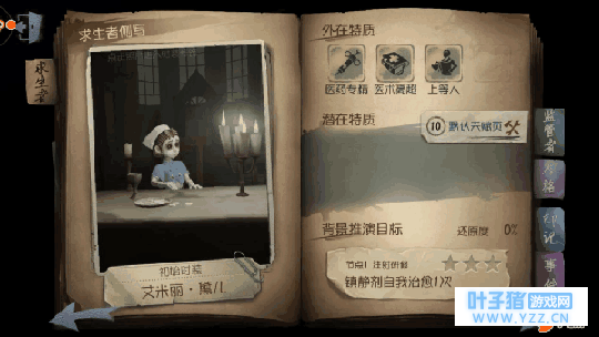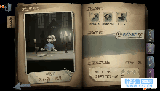 作为一名医生,她不仅仅只有一套职业装,你可以通过其他途径获得豹斑,旧装,青雅白等不同时装。当然啦,你喜欢什么衣服就穿什么喽! 作为一名救死扶伤的医生,没有几个外在特质怎么好赴庄园主之约呢? 【医药专精】:随身携带治疗工具,可以在受伤状态下治疗自己,专业技术让她在使用治疗工具时不会产生消耗。 【解读】:就是身上有血包喽,奶妈级角色。没事奶一口,反正奶多多。 【医术高超】:具有高超的医术,治疗他人的速度提升60%,使用镇静剂自疗的速度提升20%,耳濡目染下,所有人的治疗速度均提升5%。 【解读】:辅助角色,术业有专攻,医生当然比其它角色更懂医术喽。 【上等人】:医生出生优越,身娇体贵,其板窗交互速度均降低15%。 【解读】:没办法,为了学救人之术,自己却耽误了锻炼身体,体质娇弱的小女子一枚。