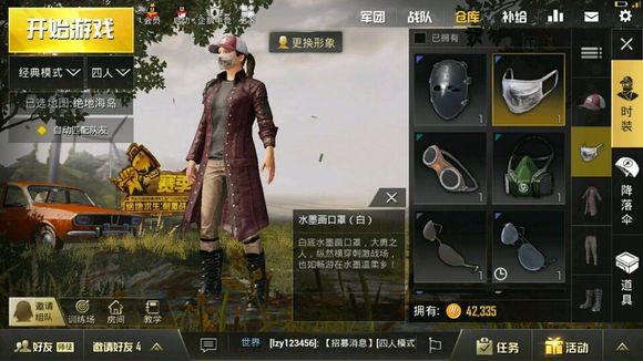 不过这件白色的企鹅电竞T恤只有注册的企鹅电竞主播才可以领取,而且全服只有9000件,属于一款绝版的T恤,因此我将它排到了第十位。 NO.9 水墨画口罩 这款带有浓重中国水墨风格的口罩是只有在体验服才能够获得的稀有饰品。 不过后来在企鹅电竞的主播通过直播时长,也可以领取到此口罩,但是总的来说这款口罩数量不多,保守估计不超过2000个。不过因为口罩的人气值不高,所以将他排在了第九名。 体验服最近才开放了申请资格渠道,想要的小伙伴赶紧去刺激战场官网网页中进行申请吧~
