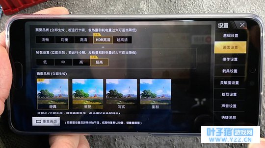 由于要测试游戏流畅性,所以我们在《绝地求生:刺激战场》的游戏画面设置上,把画面品质设为HDR高清(超高清暂不支持)、帧数设置为超高、采用经典画面风格、开启抗锯齿选项、开启流畅自适应选项。