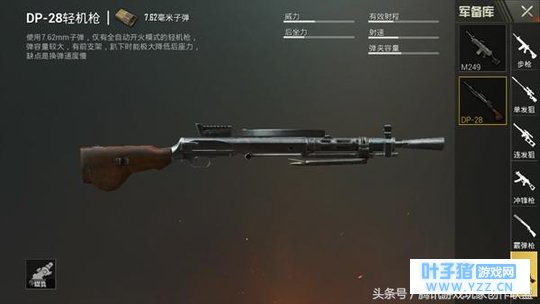 从官方给出的数据面板上来看, VSS的伤害确实低的可怜,是狙击枪中伤害最低的枪械不说,它的威力甚至和步枪相近,但是VSS瞄准镜的实用性却不可估量,它自带4倍瞄准镜,可以给玩家提供远程的视野,在玩家没有高倍瞄准镜的情况下,VSS的侦查能力极强。 除此之外, VSS的声音很顺耳,玩起来手感极佳。 【 DP-28】 机枪在游戏中十分少见,仅仅有两种, DP-28在地图中还可以搜索到,但M249却只在空投中出现。因为DP-28极强的稳定性极差,换子弹的速度也非常慢,而且仅有全自动开火模式,所以不被部分玩家所看好。