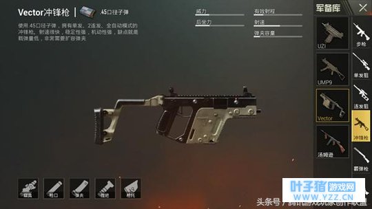 其实 DP-28属于一把策略型的枪械,它通常出现在组队模式中,虽然DP-28稳定性差,但是它的子弹数量和威力还是十分强势的,最重要的是,趴下姿势用DP-28的话会大大降低这把枪械的抖动性,所以说这枪时火力掩护和扫射载具的最佳选择。 【 Vector】 因为 Vector刚拾取时子弹数量太少,而且设计速度极快,一弹夹子弹很快就会打完,面对和敌人刚枪的局面,换子弹可以说是最致命的操作,所以说很多玩家宁愿拾取UMP9或者UZI当做过度枪械,也不愿意将Vector搜集满配。