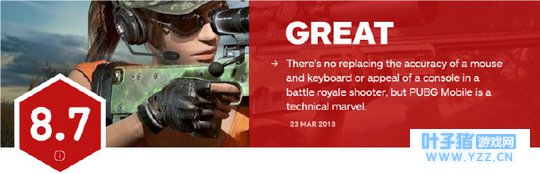 全球规模最大的游戏娱乐媒体IGN(Imagine Games Network)是一间多媒体和评论网站,在对《PUBG Mobile》的评价者给出了8.7的高分评价。 《绝地求生:刺激战场》将一款原本配置要求就很高的PC/主机游戏成功搬到了手机平台上,而且功能齐全、运行平稳,值得夸奖。触摸操作有时不太好用,而且永远不会像键鼠/手柄那样精确,但手游版便携、易得(免费)的优点更加突出。