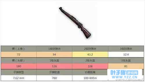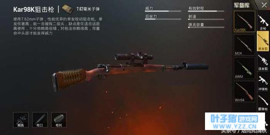 98K狙击枪,使用7.62子弹,射程为100~600m,弹容量5发,一枪爆头可以打爆2级头,子弹射速760,不可安装弹夹,可以装备狙击枪托腮班,狙击枪子弹袋,基础瞄镜,高倍狙击镜,狙击枪消焰器,狙击枪补偿器,狙击枪消音器。 98k狙击枪,推荐使用专属子弹袋,增加换弹速度。枪头推荐使用消焰器或者消音器,单发栓动狙击枪补偿器起的作用不大。 作为最常见的狙击枪,可以在任何地方包括厕所,油桶上可以捡到的狙击枪,很强。这把98K一枪打死2级头,一发入魂的快感,也是这把枪唯一存在的价值所在。