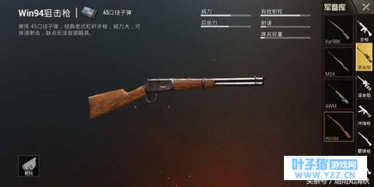 M24狙击枪,使用7.62子弹,这把枪射速790,射程为100~800m,一枪打爆损坏的3级头和完好的2级头,M24狙击枪可以安装单夹,枪头,倍镜还有枪托。M24无法使用子弹袋。安装扩容弹夹后可达到一弹夹7发子弹。M24射速较比98K快一些适合预判不是很熟的新手玩家。M24狙击枪是空投枪,捡到的小伙伴们的运气是爆表的,但是要提醒一下大家,舔空投要谨慎啊。 3、Win94狙击枪