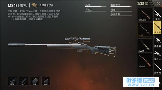 师哥登场,全场鼓掌! 上期我们讲到了狙击枪中的Mini14,一把被冷藏很久的枪,不知道有没有小伙伴解放他呢?相信用过它的朋友都应该了解到它的威力,今天就再大家推荐一把狙击枪中的神器,而且比大家喜欢的98K还猛的枪,当然这么猛的枪只有空投中出现,不然就乱套了,那就是M24。M24的伤害比98K还要高,仅次于AWM,但是AWM子弹有限,而M24只要7.62子弹便可,更加方便,很多人更愿意用M24超过AWM。