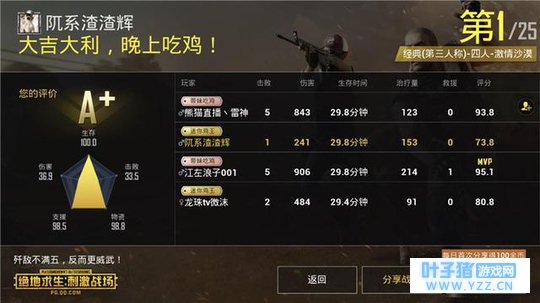 然后我们就地找了个地方等圈刷,运气还不错,一直刷在我们脸上,我们的位置也是相当不错,旁边有房区,周围还有好几个背坡可以打靶,这时候我们在前方打靶,击倒好几个,但是都被扶起来了,而妹子这时候一个人架在我们后排,这时候妹子发来信息,背后有人,于是我们赶忙上前支援。这时候妹子一个人打一队已经开始了,并且已经击倒一个,这时候在我们的火力压制之下,对方开始溃逃。 就在我们跟对面对枪之时近点房区摸了过来队人,抢了我们的房区,这我们是忍不了的,在小哥哥的带领之下,我们冲了过去。而妹子表现的异常凶猛,在狗蛋击倒二楼的对手后,妹子直接冲进了房子,而我还在殿后,这时候小哥哥也跟着冲了进去,打到了另外两个,不过被后面一个偷了屁股,好在我这个殿后的正好在这家伙后头,直接一梭子轻松击倒。这样我们在一阵欢快的舔包之后进入了决赛圈。 到了决赛圈,就剩一队在山坡上跟我们对枪,这时候妹子又勇猛了,一个人冲了上去,先灭了一个然后被击倒最后被残忍的补掉,这时候小哥哥也跟着冲了上去,击倒两个,然后也被放倒了,这时候又是我这个殿后的关键先生,又发现了最后一个对手的踪影,两枪爆头直接带走,就这样在妹子凶猛的冲击之下我们顺利吃鸡,最后伤害人头一对比简直惭愧,妹子居然比我高了许多,这简直是我偶像。