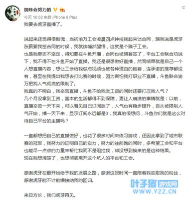 今天又有一位刺激战场的头部主播选择了跳槽。这位刚刚拿到刺激战场城市联赛武汉站冠军的【蜘蛛】是刺激战场的头部主播之一。而他的跳槽就不仅仅是宣布换个东家了,还牵扯出了平台和工会间的黑幕,称自己合同被骗签。斗鱼不给发工资的同时还要打压人气。