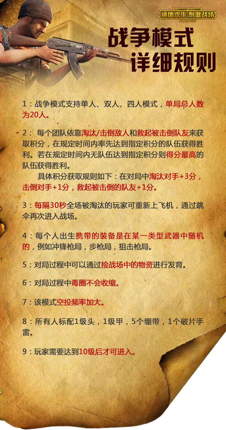 新模式:战争模式 可以带枪跳伞、无限复活 。20人模式,每隔30秒被淘汰的玩家可重入战场。 评分规则通过淘汰对手、救助倒地队友获得积分,15分钟内率先达到指定积分的玩家或队伍即可获胜,或时间结束,积分最高的玩家或队伍获胜。 半个小时跳伞60次真的不是开玩笑的哦!带着武器从天而降是怎样的感受呢,小白裙预感鸡友们的成盒姿势将会更加的妖娆呢! 接下来就让小白裙带大家一起了解下战争模式的详细规则吧! 娱乐模式新增战争模式