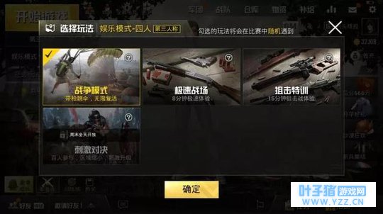 1、新增加一个娱乐模式——战争模式 :玩家在飞机上可以带枪跳伞,落地速度比普通模式要快很多,玩家被击杀以后可以无限复活,最后的输赢是以人头数计分玩家在飞机上自带98K和4倍镜,一级头和一级甲,还自带绷带,如果玩家不想使用狙击枪那就得自己去房区搜寻了。