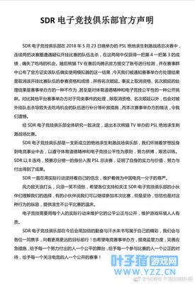 5月24日晚,国内SDR电子竞技俱乐部发布声明称由于熊猫直播举办的PSL绝地求生刺激战场比赛中存在开挂队伍以及赛事方不公平的行为,决定退出PSL绝地求生刺激战场比赛。