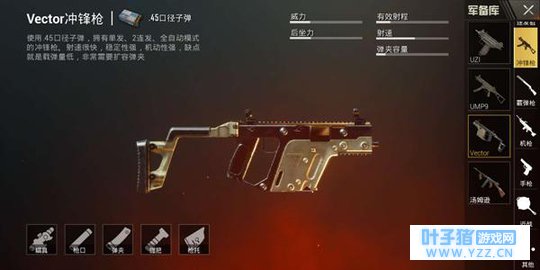 对于现在流行的5.56步枪来说,曾经较为辉煌的AKM慢慢的也退出了众人视线,但是对于打野玩家来说,AKM相当于一把中近距离的全能武器。中近距离全自动射击模式保证压枪,AKM就能将极大的伤害倾泻到敌人身上。如果拾取到了高倍镜,AKM也可以切换到单发模式,作为一把“狙击枪”使用。 冲锋枪:vector