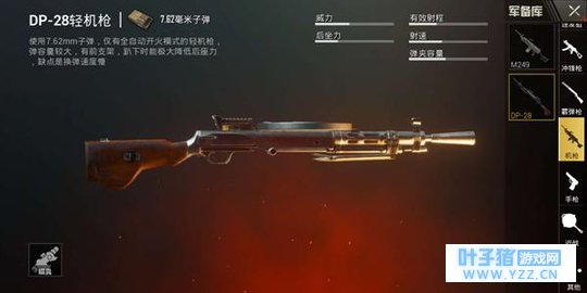 机枪:DP-28DP-28速成大盘鸡,对于打野的玩家来说可以说是一把神器了。47发载弹量以及稳定的弹道,一般情况下搭配红点瞄准镜就可以正常使用了。相对较高的后坐力带来的是极高的伤害。但是如果伏地射击的话,可以极大的减小后坐力。 一般情况下,使用DP-28搭配四倍镜,即便是和200米左右的距离的SKS对射也毫无任何压力,整把枪唯一的缺点可能就是极慢的换弹速度了。