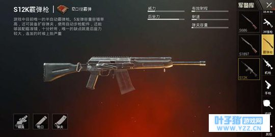 一直以来,vector都是一把非常极端的冲锋枪,各项数据在冲锋枪族中极为优秀,唯一的缺点就是载弹量太低。原配的vector只拥有13发子弹,搭载扩容弹夹后能够达到25发。但是搭配极高的射速,vector面对中近距离的敌人,依旧是毫无任何压力。只要反映足够快,就能赢。 霰弹枪:S12KS12K的配置比较尴尬, 是唯一一把能够安装八倍镜的霰弹枪,但是实际上,S12K最大的特点是在于载弹量以及相对较快的换弹速度。尤其是攻楼的时候,S12K堪称一把神器。