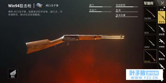 单发狙:win94Win94的尴尬地位,无非是因为win94无法安装瞄准镜的原因,但是除了无法安装瞄准镜外,win94的各项数据都非常优秀。如果在沙漠地图上捡win94不妨试一试远距离射击。与此同时0.45口径的子弹,更是随处可见。
