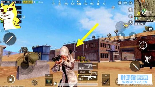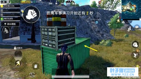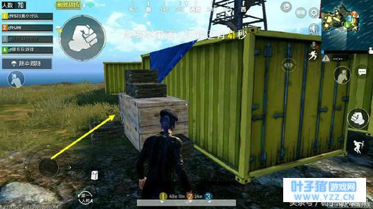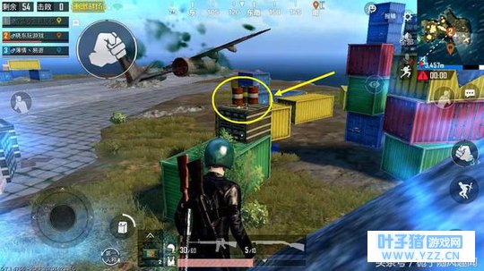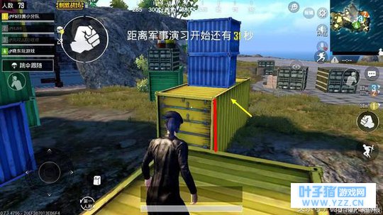 过来后就面对第一个难关了,需要跳到对面的黄色集装箱,看图中红色线,这个距离有点远,掌握好最直线距离,然后一鼓作气就行了,真不行就到训练场多练练,或者干脆到娱乐模式的出生岛练,时间到了就退出,只是对队友有点不公平,不太推荐这种方法。