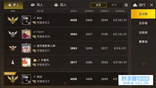 而更厉害的是,8GK还用不到一周的时间,占据了刺激战场单人总分排行榜第一位。甚至连段位都毫无疑问的遥遥领先。不得不说,将他称作灭霸当真是名副其实。