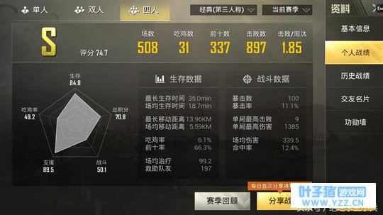 刺激战场 难道是吃鸡率?有可能,如果是单排,能都在皇冠,或者是王牌!这些人的实力都是非常强的,尤其是单排上王者的,钢枪实力那就不用多问了!(不过还是有区别的,要看这位玩家喜欢玩的是什么地图了,玩沙漠地图的就是以上所述,而绝地海岛的,意识可能就比枪法要高一些)如果不是单排呢?四排呢?那无非就是抱大腿呗,一个菜鸟找三个大神带着,吃鸡率不高才怪!