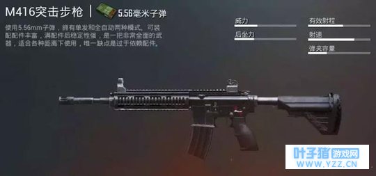 究竟“口径即是正义”OR“稳定才是王道”?下面就由小编分析一下最新的步枪战斗力排行! 第四名 M416 这把步枪是削的最惨的一把步枪了,很多人看到这把枪都不捡了,去捡冲锋枪了,M416在没有战术枪托的情况下后坐力很难控制,子弹下坠也很厉害,几乎是步枪中垫底的。