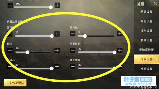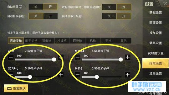 装备系列:所有武器的子弹,光子是按照枪械来设定的,你可以设定这些枪子弹上线,实际上在比赛中,5.56子弹、7.62毫米子弹是用到最多的,你可以对这些枪械设定自动捡多少。其中自动拾取手枪功能可以关闭。