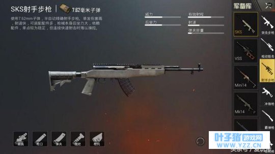 而连狙SKS也不叫狙击枪了,改为射手步枪,虽然名称改变了,但是他的属性还是和狙击枪一样,可以装备高倍镜,普通步枪是不可以的。现在SKS比较受玩家欢迎,较为稳定的后坐力和不错的伤害使他最多4发子弹就能带走一个高级防护的敌人。满配的SKS的对拼能力和狙击能力更上一层楼,完全不虚98K。