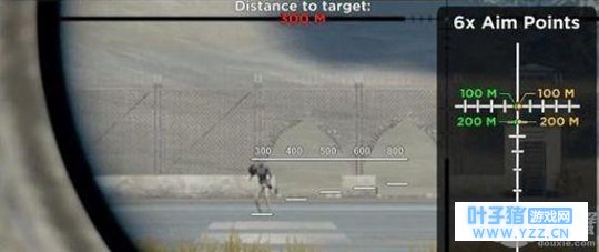 当距离延长至300米,这个时候咱们就可以利用位于镜头左下方的测距仪来大致估计目标的位置了。可以看到,这个时候目标与射击者之间的距离不多不少恰好是300米。