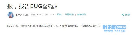 现在大家都发现全军出击的玩家越来越少了,官方不想着怎么吸引玩家,只想着怎么发展不被玩家发现的AI,让机器人更加灵活。这是个被游戏耽搁的AI制作公司?听小编一句劝,与其发展智能机器人,不如用心钻研游戏提升自己游戏品质的质量,把玩家从刺激战场那抢回来,一堆机器人只会让玩家流失越来越严重。恶性循环。 除了机器人的问题,全军出击随着版本的更新,BUG越来越多,我只听说过版本更新BUG会减少,游戏会更加流畅。全军出击负优化更新的这种操作闻所未闻。这里跟大家吐槽个小编玩游戏打时候遇到的超无语BUG。 小编和队友双排,本来想开车跑毒,结果我人还在原地车自己动了,这是什么情况,车上并没有人,车会自动漂移么?这是为了让机器人更智能,不小心把车也变成ai了?全军出击能给我一个合理的解释么,我和队友根本没法上车。最后活活被毒圈毒死。这辆车影响了我这一场比赛的游戏体验,这真让我失望。果不其然,论坛又发现了和小编一样遭遇的玩家。自此之后,全军出击玩家减二。