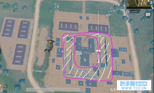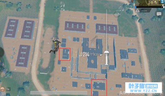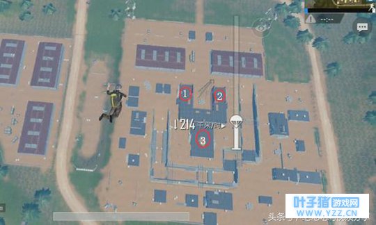 【落点选择】首先要了解到,选择该点位的玩家大部分都是属于钢枪选手,如果想要安稳发育的就不建议选择此点。 落地钢枪:落地钢枪的玩家我们建议可以选择点位中线的三角楼主体建筑落点。该建筑为双层楼梯,但可以上到楼顶,且楼顶资源丰富异常。一把情况下可选择三个位置落点。如下所示: 因为该建筑物资丰富度当属区域之首,所以一般落点玩家较多,而我们以上划分的三个点则是楼顶区域,同时三个区域均有直通楼下的通道,1、2位置旁边就是楼梯。3位置则可以直接直跳一楼。在无法抢先楼顶对手拿到枪的情况下,三个点都可以较为快速的规避先拿到武器对手的攻击。