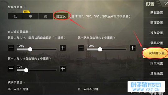 点击灵敏度设置,再点“自定义” 系统有推荐的,但这里说一下,灵敏度最好不用系统推荐的,不然很难驾驭,所以我们必须自定义一下。