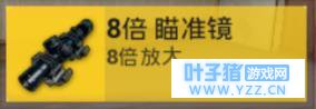 8倍镜 也不记得哪个版本开始,8倍镜开始不能在步枪上装配了,所以8倍镜的使用率也下降了很多,但是即便如此,依旧改变不了8倍镜在人们心中的信仰,尤其是98K+8倍镜再来一个消音器,绝对是敌人的噩耗。金锋每次遇到,不管有没有狙击枪,都要毫不犹豫的捡起来,不管是打人还是观察,都少不了它。