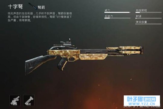 当然其他玩家不喜欢这把武器还有别的原因,首先是配件比较少,而且瞄准镜只能装配普通瞄准镜,没有枪口、扩容弹夹这些配件,但这些也无法阻挡这把武器的强大,因为这把武器的稳定性特别好趴下的时候完全就是自带一个枪托,伤害也不俗,而且有47发子弹可以使用简直是LYB们居家旅行杀人灭口必备良药。 TOP.1【十字弩】