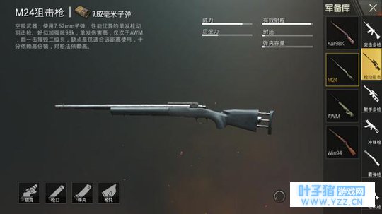 其实SCAR-L还是非常热门的,很多玩家甚至使用SCAR-L都不选择M416,虽然威力没有416高,可是它的优势在于射速快,再配合扩容弹夹,攻击也是杠杠的。 TOP3:M24栓动狙