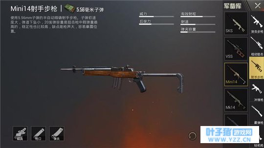 而Mini14就完全不一样,它是一把不吃配件的狙击枪,它的配件一共就三个,枪口、弹夹和倍镜,除了倍镜,Mini14其它配件都可以没有。 因为Mini14自身后座力不大,在没有枪口的辅助下依旧完胜SKS,而且Mini14自身弹夹就有20发跟满配的SKS一样。当然在满配情况下Mini14威力更大,30发弹夹媲美步枪,同时射速上也不差,总体上一点不弱于SKS。