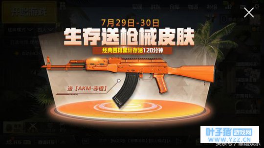 大家好,这里是来自靠谱娱乐的吃鸡小鱼,为你搜集最新最热的吃鸡手游福利资讯。 昨天,就在小鱼登录刺激战场的手游,一惊!竟然有个活动 免费送AKM赤橙皮肤 。而且只限时两天时间!难不成送的是 永久 吗?