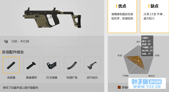 维克托冲锋枪 维克托冲锋枪,又叫短剑冲锋枪,也被许多喜爱它的玩家称为“虎皮”。初始只有十三发的弹容,伤害也不高,被很多小激友所嫌弃。但满配后有了二十五发的子弹,并且稳得一批有木有?!!超高的稳定性即便是装上高倍镜去劝架也毫无压力。