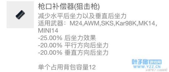 2. 配件选取,你不知道的差别 自从某次更新后,步枪配件可以适用于狙击枪以来,连狙满配比以前简单了许多,对于步枪与狙击枪对应的配件,分别有枪口、弹匣、握把是通用的。 很多人以为这些配件属性完全一样,但是其实有一个例外—— 枪口补偿器 !