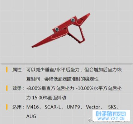 减少了后座力恢复时间,但增加了垂直方向的后座力,在实战中任何枪使用它估计手感都不咋的,缺点太明显,尤其不利于扫射,SKS远距离单点的话可以,实在没有握把可选择的情况下才会考虑。 半截式握把