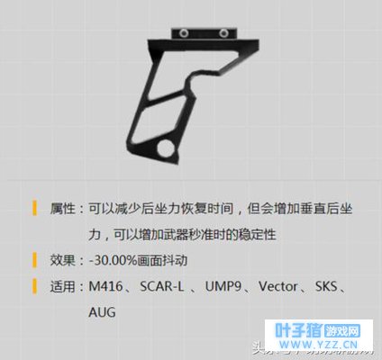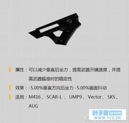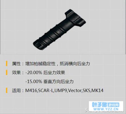 自动步枪、冲锋枪、狙击枪都可使用,-20%的平行方向后座力,更加适用于步枪中近距离泼水扫射,配合单点。 垂直握把