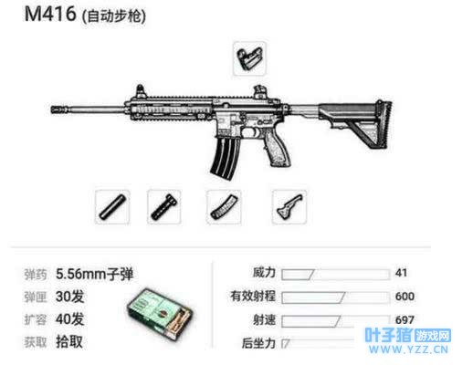 二:M416步枪。这把步枪是最需要配件的一把步枪了。这把枪要是没有配件的话,相当难用。一些老玩家都很难发挥出它的威力,就更别说一些其他的新手玩家了。这把步枪在满配的时候相当厉害,伤害比较高,而且子弹容量也比较多,稳定性更是无可挑剔,有时候满配的M416可以和空投当中的一些步枪相比。