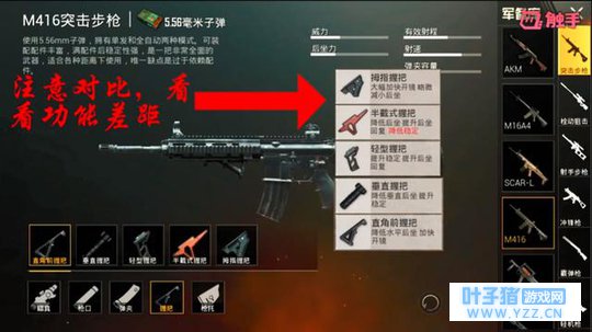 (1)直角前握把。能够加快开镜速度,虽然对于后坐力的增益没有垂直握把高,但是直角握把同时能够减少子弹分散。特别是在对枪中,更快开镜,子弹命中率更精准才是制胜的关键。 (2)垂直握把。降低后坐力效果明显,稳定性提高。非常适合萌新和手残党玩家进行压枪。