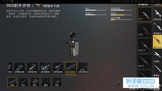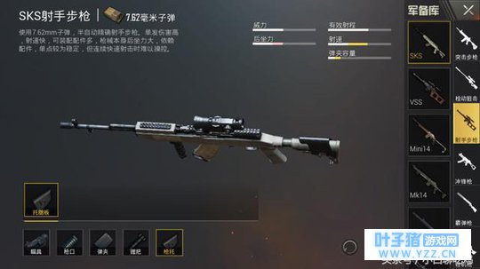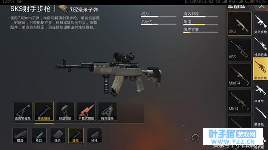 握把配件: SKS是刺游戏中唯一一把可以装备握把的狙击枪,大家经常会纠结握把怎么选择,因为大神和萌新打差距往往是在这里,在这里小编给大家推荐的是垂直握把,垂直握把可以降低垂直后坐力,减少画面晃动,简直是狙击枪的必备配件!