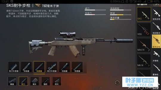 从数据上看,SKS的优点和缺点都非常明显,伤害高,射击间隔短,只有不到0.1秒,理论上手术够快一秒10枪不是梦!然而缺点是稳定性差!所以在配件选择上,就要考虑如何稳定枪械,以提高更多的命中率! 配件选择:倍镜配件: 对于狙击枪来说,最最重要的就是倍镜配件了,一般来说狙击枪的倍镜都是越高越好,但是SKS因为后坐力较高,所以给大家推荐四倍镜和六倍镜,而不是大家都认为的八倍镜!因为你会发现经常用八倍打完一枪后会问自己在哪里!