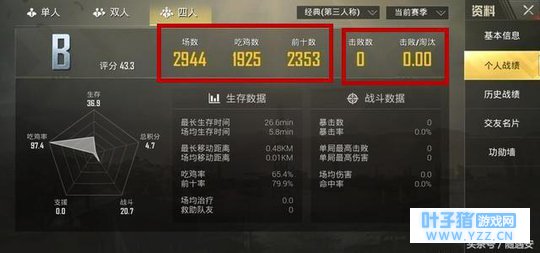 首先咱们来看一下这个大神的个人信息面板,吃鸡2944场,查56场就3千场了,这个绝对是大神级别的。最为关键的是,这位大佬的吃鸡总数为1925场,啧啧百分之65的吃鸡率,这已经非常的高了!小编看到了之后的第一个想法就是,可以让大神带飞了! 不过细心的玩家已经发现了吧?好像哪里不对劲啊!是的,后面的击杀和淘汰,竟然都是0!小编觉得可能是我的数据延迟了,网有点卡,然后不显示!不过在看到他的历史战绩之后,小编更是无语了!
