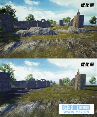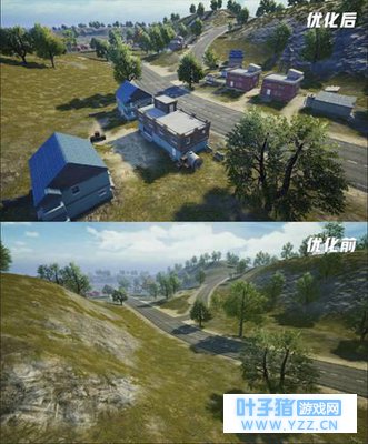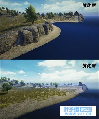 小摩托只在雨林地图下刷新哦~体型小颜值高,可以承载两个人。虽然速度慢,但是它很灵活,转弯上坡都很方便,载具的耐久度与一般摩托车相同,在雨林地图的地形也是非常适合了。 游戏优化 地图优化 在地图优化上,我们有选择性地把优化重心放在与玩法相关的地图改动上。我们希望地图优化的最终目的是为鸡友们带来更多的战术玩法,为丰富鸡友们游戏体验服务,而不仅仅是视觉观感上的提升。 因此,我们在部分地区增加了小型陆地和岩石,方便鸡友们在渡海过程中进行战术调整。这样一来你就可以利用掩体进行攻守转换啦!