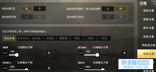 这是子弹拾取上限设置,烤羊腿的设置是,对于突击步枪,她的建议是,7.42毫米子弹设置上限是100发左右,M14A4的子弹拾取上限180发,M416的则是250发左右!