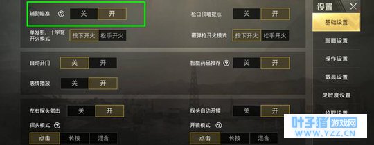 对于辅助瞄准设置,小伙伴们是怎么设置的呢?腿哥选择的是开启辅助瞄准,这样在对狙等一对一对线时,可以有效帮助你击杀敌人!(适合1对1,1对多情况下辅助设置有一定弊端)还有就是智能药品推荐,同样是开启!