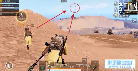 绝地求生:刺激战场 4:现在已经缩圈了,我们现在只剩两个人了 ,我现在和我的游戏队友,准备往安全去出发了,我和我的队友们都说好了,如果玩沙漠模式的话我们,我们一个队全部穿着,一套衣服裤子一模一样的,在沙漠模式,不要,穿黑色衣服和黑色裤子,穿黑色的很容易让敌人发现你,所以我们全部选择,一样的衣服和裤子,现在我们往安全区出发了,我们前面掉下来一个空投了,在沙漠模式,空投掉,在你面前不要直接跑过去捡,因为很多人盯住这个空投,我们也先盯住这个空投如何,时间很长了,没有人过来捡的时候我们再过去捡,因为有很,游戏玩家很心急,看到空投箱就马上跑过去捡,这样子很容易让敌人发现你的。